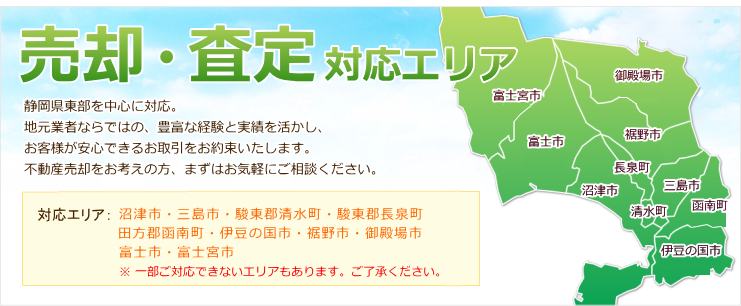 静岡県東部 沼津市 三島市 長泉町 清水町 裾野市 御殿場市 富士市 不動産の査定 売却 買取ならお任せください。